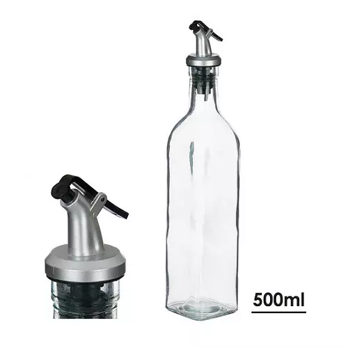 Aceitera vidrio con tapón dosificador, capacidad 500 ml. Medida 5 x 5 x 30,5 cm