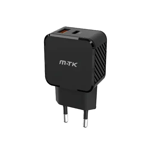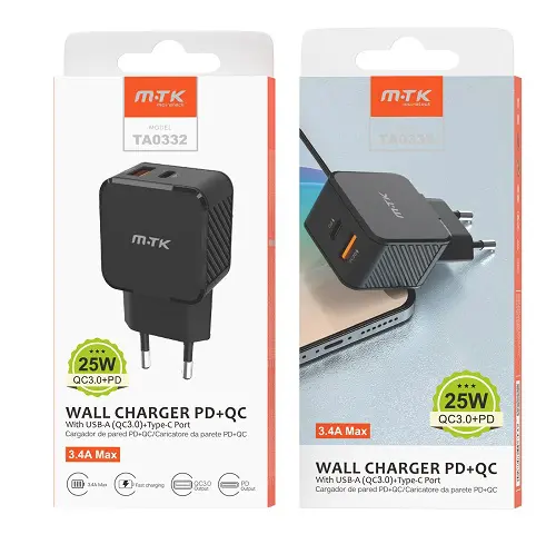 Cargador de Red Rapida Fay, 2 puertos (PD+QC 3.0), Sin Cable , 25W/3.4A(Max), Negro