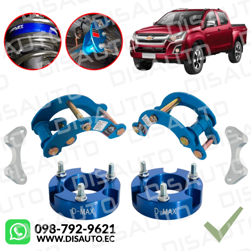 - «¿Quieres levantar tu Vehiculo sin modificar toda la suspensión ni gastar una fortuna? Este kit de alzas de 1 pulgada te da más altura, mejora el despeje del suelo y realza el look de tu camioneta. Está fabricado en aluminio de alta resistencia, incluye brazos de control superiores para no comprometer la geometría ni la estabilidad, y es fácil de instalar. Ideal para ciudad, campo y trabajo. ¡Solo en Disauto!»