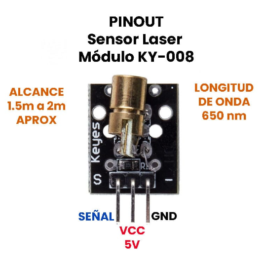 El Sensor Laser Módulo KY-008 es un emisor de luz láser de color rojo que cuenta con un cabezal de cobre para darle mayor resistencia y una disipación de calor que se produce por el láser.
