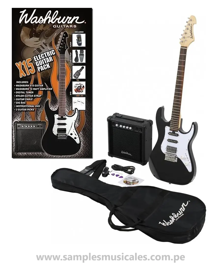 GUITARRA ELECTRICA X15B PAKE?A WASHBURN Pack de guitarra incluye: * Guitarra x15 * Amplificador 15w * Afinador digital * Correa * Cable de guitarra * Funda * Uñetas