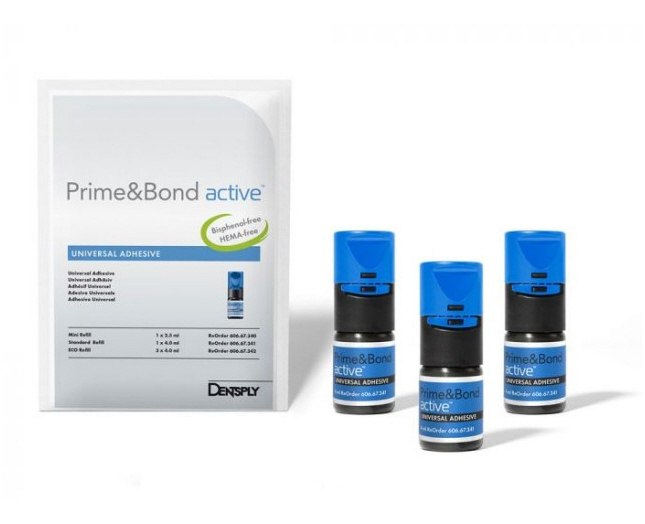 Adhesivo universal con control activo de la humedad, supera la tensión superficial del agua y se dispersa a través de la dentina dentro de los túbulos dentinarios, formando una capa uniforme y homogénea. Adhesión fiable en dentina tanto sobrehumedecida como desecada.Tras el secado con aire, el solvente y el agua se evaporan juntos, dejando una capa consistente de adhesivo en toda la superficie, asegurando así una adhesión fuerte. Fácil de usar. Resultados consistentes. Elevada adhesión. Control activo con Prime&Bond active. Prácticamente sin sensibilidad postoperatoria Grosor de película muy delgado lo que reduce el riesgo de encharcamiento y el desajuste de la restauración Una formulación patentada libre de HEMA, TGDMA o bisfenol Tiempo de trabajo reducido y menores desechos, ya que sigue siendo utilizable tras 30 minutos en un CliXdish cerrado