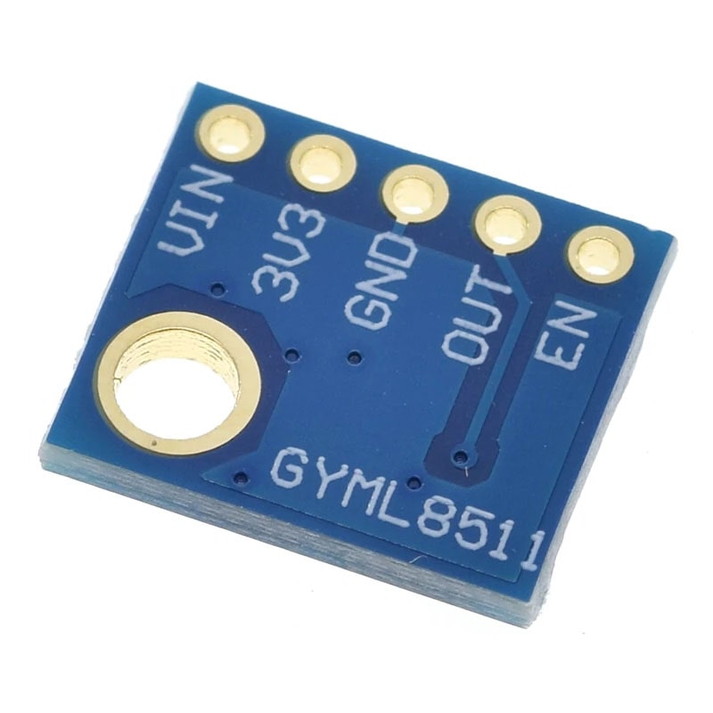 El desbloqueo ML8511 es un sensor de luz ultravioleta que es fácil de usar. El sensor MP8511 UV (ultravioleta) funciona emitiendo una señal analógica en relación con la cantidad de luz ultravioleta que se prueba. Este desbloqueo puede ser muy útil para crear dispositivos que adviertan al usuario sobre las quemaduras solares o que prueben el índice UV en lo que se refiere a las condiciones climáticas.
