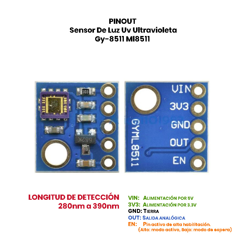 El rango de la luz más efectiva probada por el sensor es 280-390nm. Esto se clasifica como parte del espectro UVB (rayos ardientes) y la mayor parte del espectro UVA (rayos bronceadores). Emite una tensión analógica que está relacionada linealmente con la intensidad de UV medida (mW / cm2). ¡Si su microcontrolador puede hacer una conversión de señal analógica a digital, entonces puede probar el nivel de UV!
