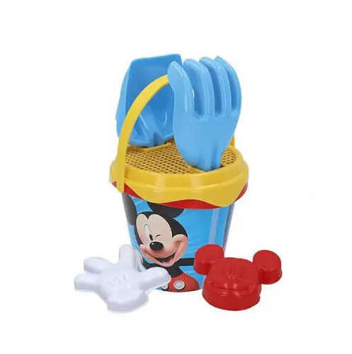 Conjunto de playa de Mickey Mouse que incluye un cubo con cedazo, pala, rastrillo y dos moldes. Dimensiones: 14 cm.