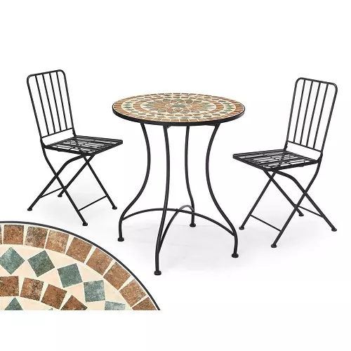 Set de mesa mosaico marrón con 2 sillas, fabricados en metal y cerámica. Medidas: Mesa abierta: diam 60 cm x 71 cm Silla abierta: 37 x 50 x 86 cm