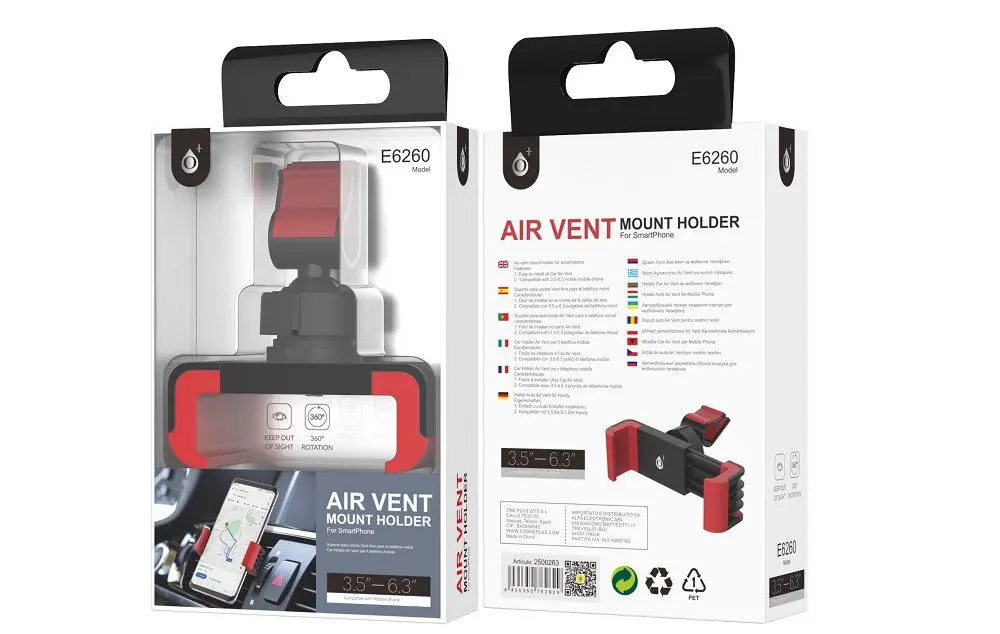Soporte de móvil para colocar en la rejilla de ventilación de aire del coche. De color rojo y negro. Ajustable y extensible. Hecho de plástico resistente y duradero.